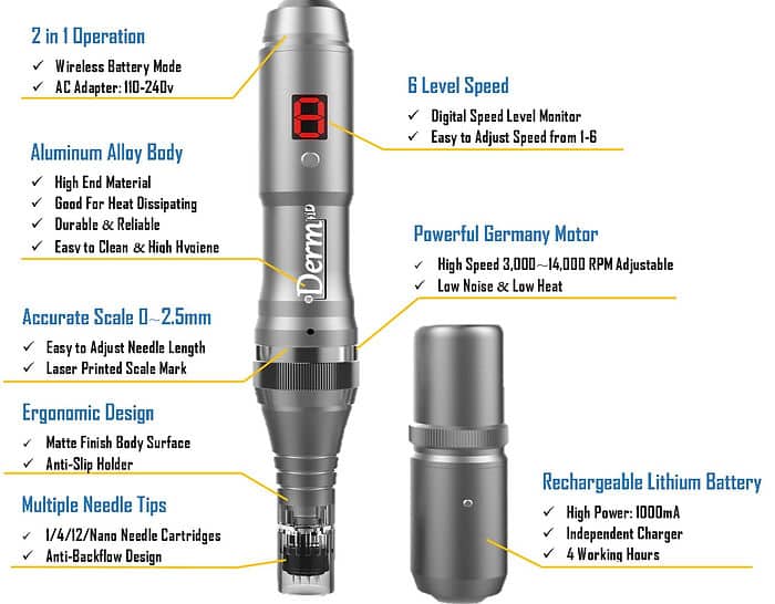DermHD is one of the most advanced, cutting-edge Automated MicroNeedling device, offering a powerful German DC Motor with adjustable reciprocating needle length.