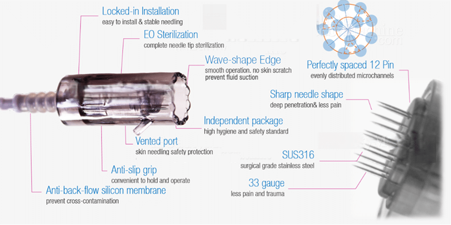 - Needle thickness: 33 gauges, creating tiny microchannels with less pain and trauma.